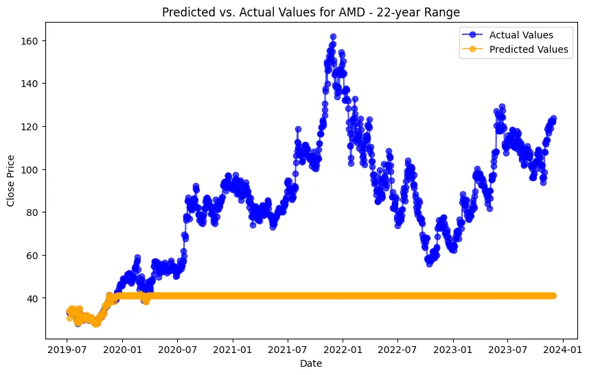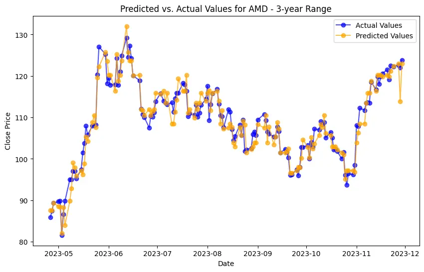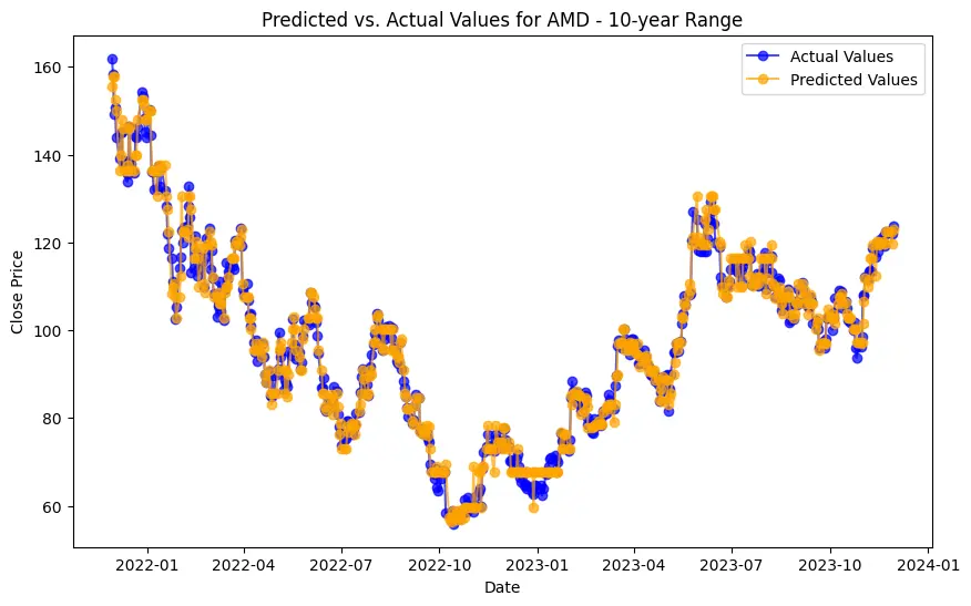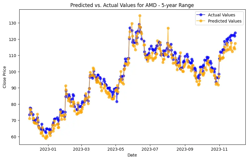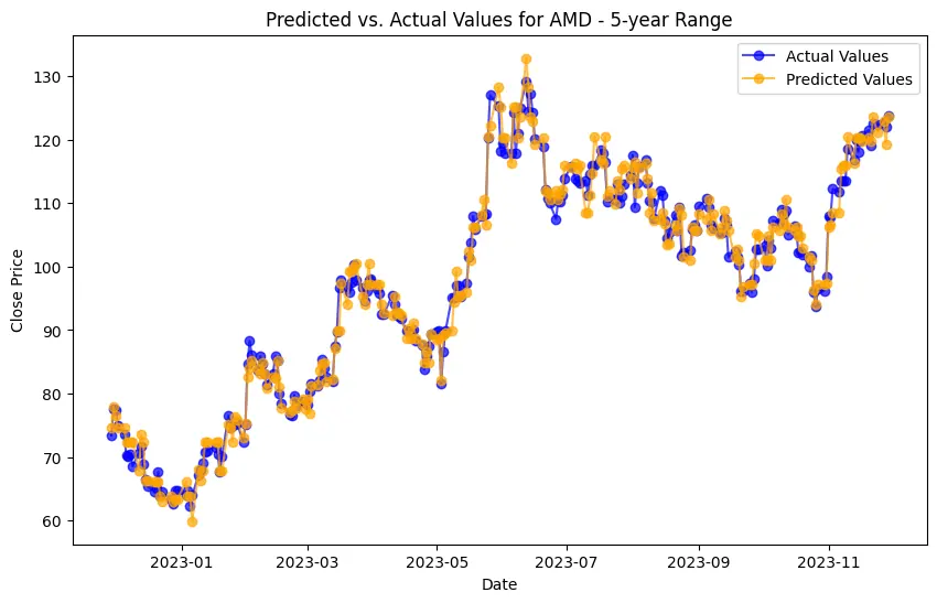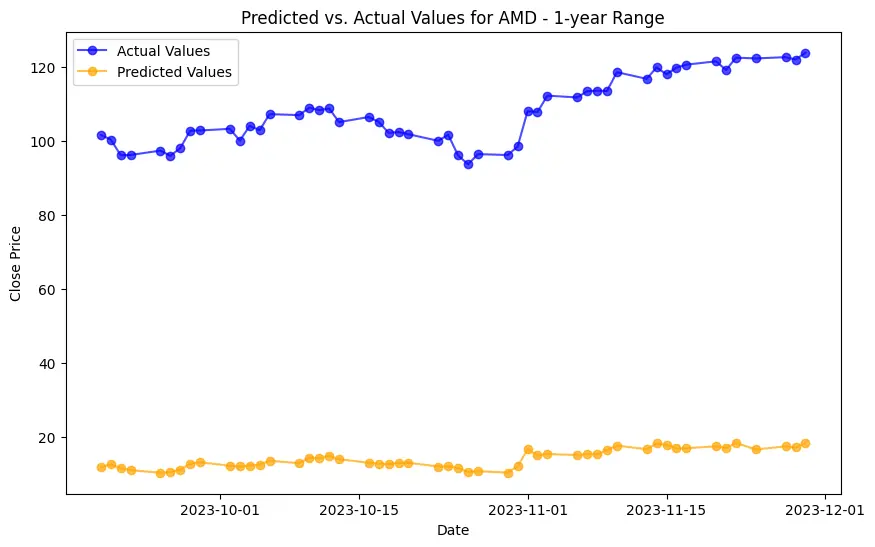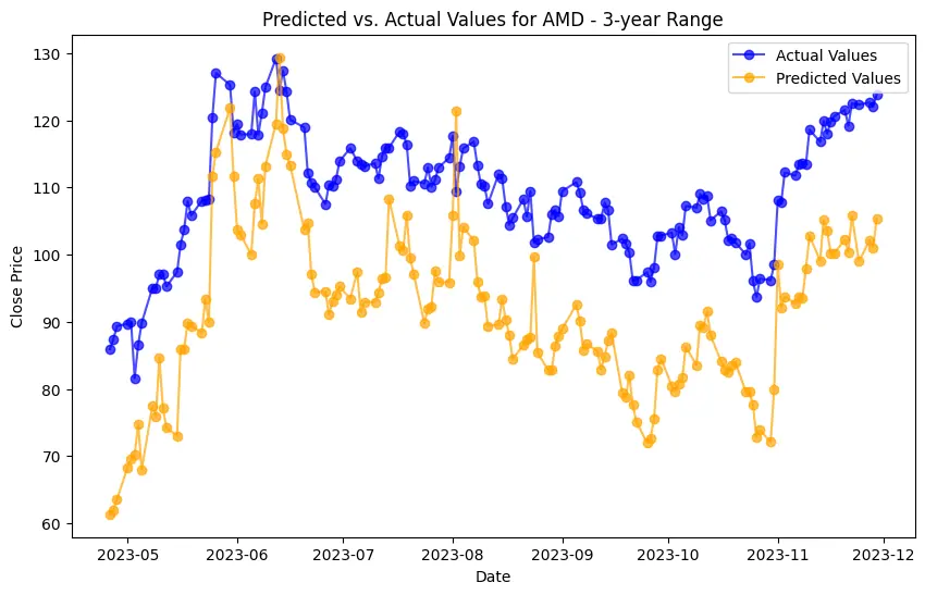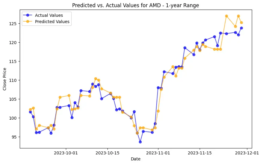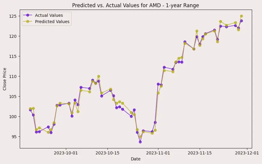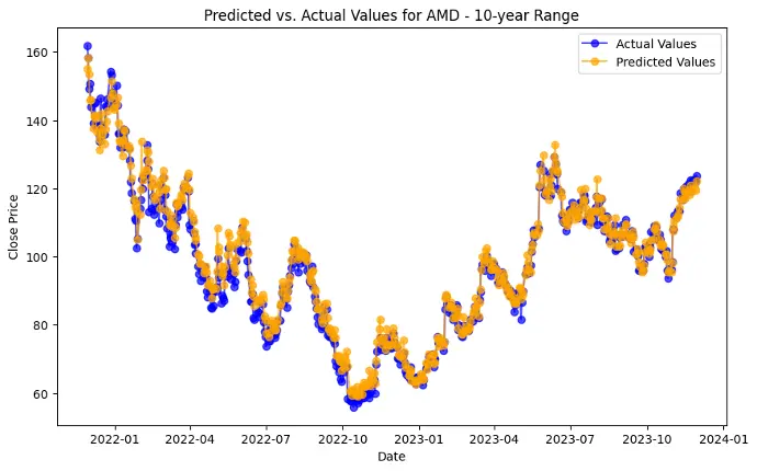 In the case of AMD, the accuracy of predictions varied significantly depending on the time range and the model used. For the 1-year range, the linear regression model demonstrated excellent performance, with a Mean Squared Error (MSE) of 0.0052, Mean Absolute Error (MAE) of 0.0504, Root Mean Squared Error (RMSE) of 0.0722, and an R2 score of 84.29%, indicating a strong correlation between predicted and actual values. However, the LSTM model performed poorly, showing a significantly higher MSE of 0.2823 and RMSE of 0.5314, along with a negative R2 score of -7.13%, indicating a poor fit. Similar trends were observed across different time ranges, highlighting the sensitivity of the models to the time horizon of the data.