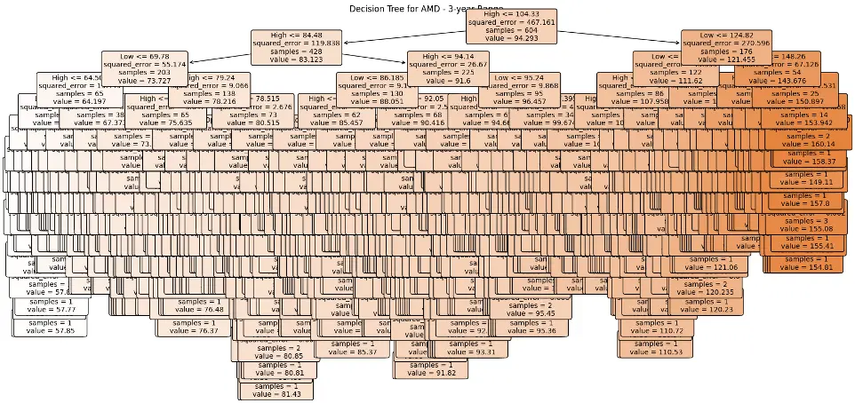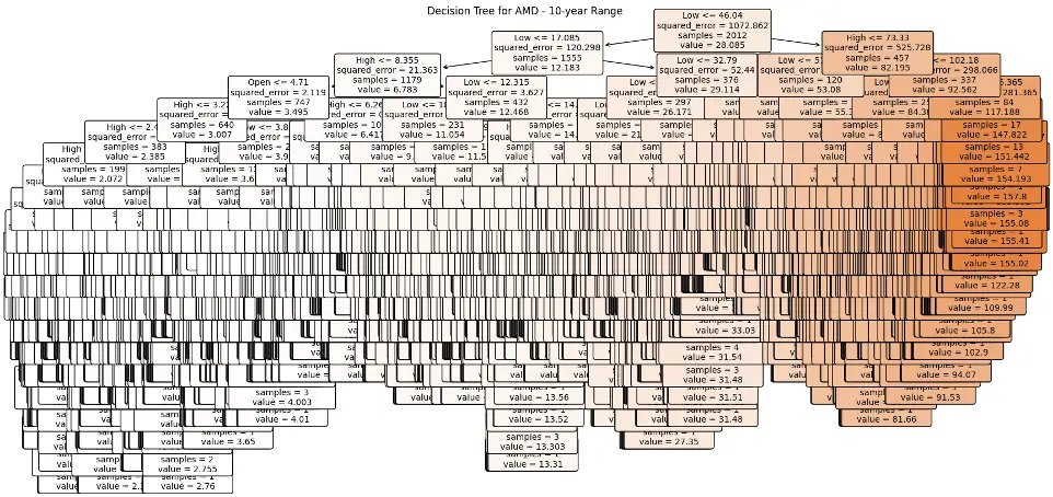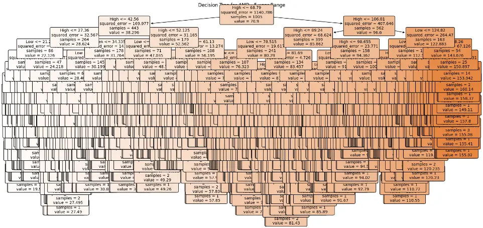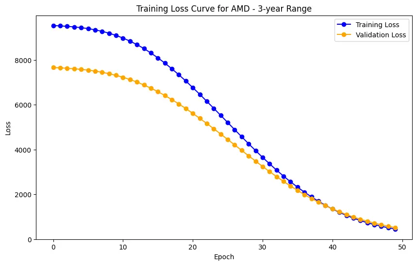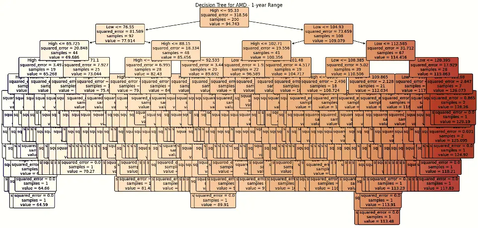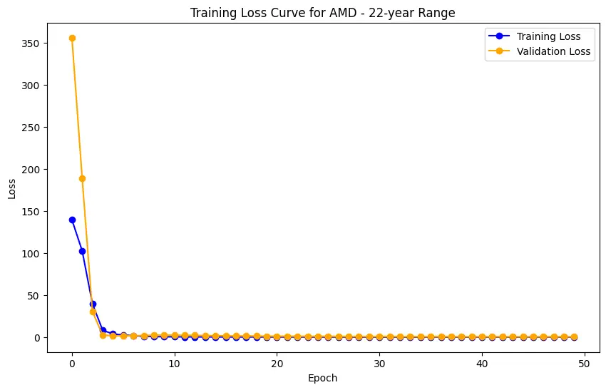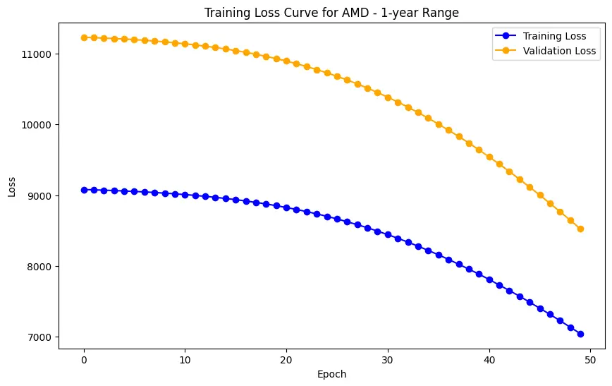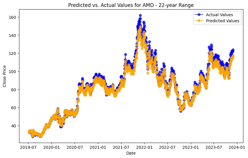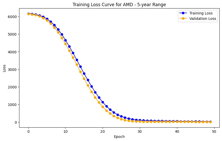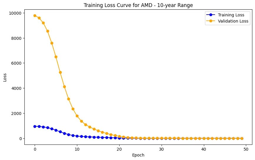 In the case of AMD, the accuracy of predictions varied significantly depending on the time range and the model used. For the 1-year range, the linear regression model demonstrated excellent performance, with a Mean Squared Error (MSE) of 0.0052, Mean Absolute Error (MAE) of 0.0504, Root Mean Squared Error (RMSE) of 0.0722, and an R2 score of 84.29%, indicating a strong correlation between predicted and actual values. However, the LSTM model performed poorly, showing a significantly higher MSE of 0.2823 and RMSE of 0.5314, along with a negative R2 score of -7.13%, indicating a poor fit. Similar trends were observed across different time ranges, highlighting the sensitivity of the models to the time horizon of the data.